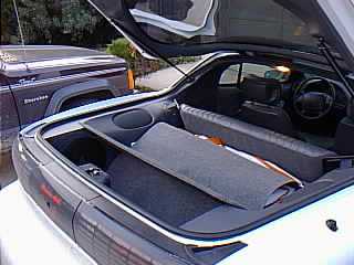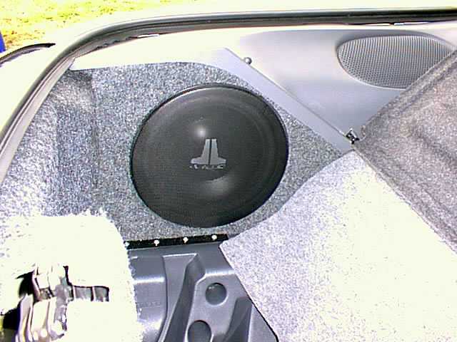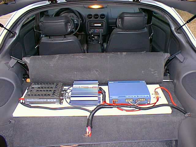 My system starts with a Clarion CD head unit. This unit was chosen because of its sound quality and ease of use. It does not have a lot of special features but the sound quality is good. Its RCA pre-amp output goes to an Audio Control equalizer crossover. This unit has outputs for low frequencies (<90Hz), high frequencies (>90Hz), and full pass. The equalizer is 15 bands per channel and an RTA needs to be used to set it properly. The low frequency output goes to a HiFonics amplifier which is bridged to drive the subwoofer located on the driver's side of the hatch area. The high frequency output goes to the Soundstream amplifier which has 4 output channels. 2 of the channels power the rear speakers for rear fill. The other 2 channels power the component set up front. The component set consists of a MB Quart midrange and tweeter mounted in the factory locations. Crossovers for the midrange and tweeter is mounted by the spare tire. The amps were chosen for their high power output and low distortion along with their ability to drive low impedance loads which aids in squeezing out extra power. The speakers were all chosen for their winning reputation in professional competition. Both JL Audio and MB Quart have done very well with the models I chose. The equalizer/crossover was chosen for its flexibility. Another plus is that most of the system (except the head unit) is not visible from the outside.
