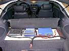 My system starts with a Clarion CD head unit. This unit was chosen because of its sound quality and ease of use. It does not have a lot of special features but the sound quality is good. Its RCA pre-amp output goes to an Audio Control equalizer crossover. This unit has outputs for low frequencies (<90Hz), high frequencies (>90Hz), and full pass. The equalizer is 15 bands per channel and an RTA needs to be used to set it properly. The low frequency output goes to a HiFonics amplifier which is bridged to drive the subwoofer located on the driver's side of the hatch area. The high frequency output goes to the Soundstream amplifier which has 4 output channels. 2 of the channels power the rear speakers for rear fill. The other 2 channels power the component set up front. The component set consists of a MB Quart midrange and tweeter mounted in the factory locations. Crossovers for the midrange and tweeter is mounted by the spare tire. The amps were chosen for their high power output and low distortion along with their ability to drive low impedance loads which aids in squeezing out extra power. The speakers were all chosen for their winning reputation in professional competition. Both JL Audio and MB Quart have done very well with the models I chose. The equalizer/crossover was chosen for its flexibility. Another plus is that most of the system (except the head unit) is not visible from the outside.